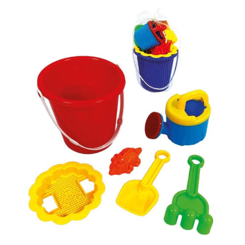 Seau garni uni, de 15 cm de diamètre, et divers accessoires (arrosoir, râteau, pelle, moules à chateau de sable).