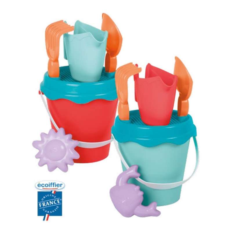 Seau garni uni, avec pelle, rateau, arrosoir, moule, passoire.