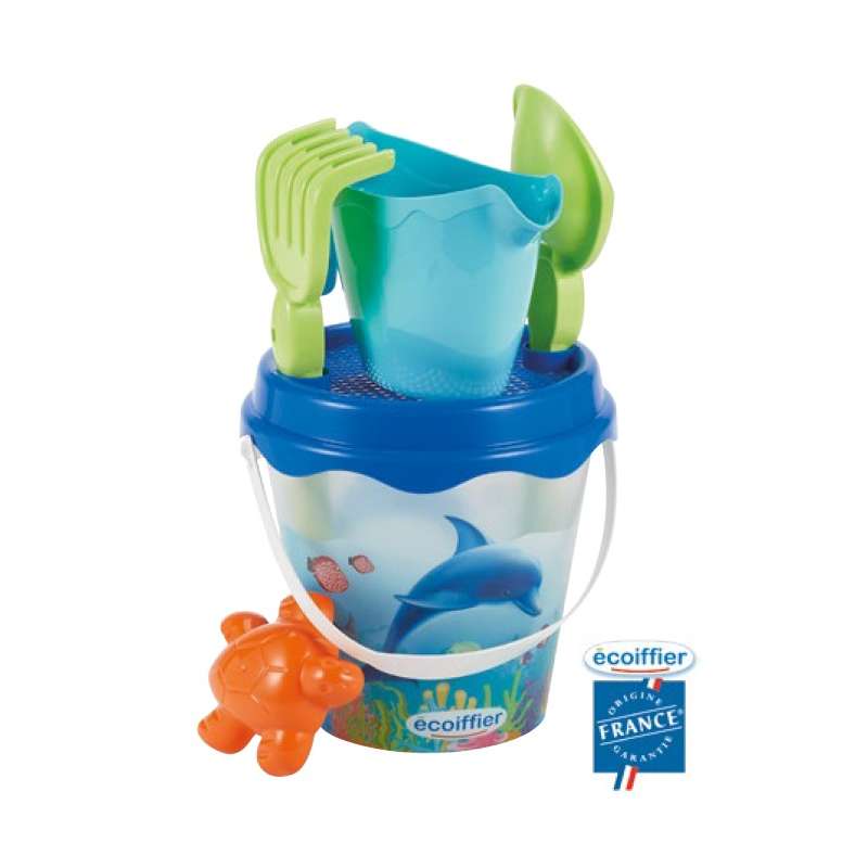 Seau garni DAUPHINS, avec pelle, râteau, arrosoir et un moule
