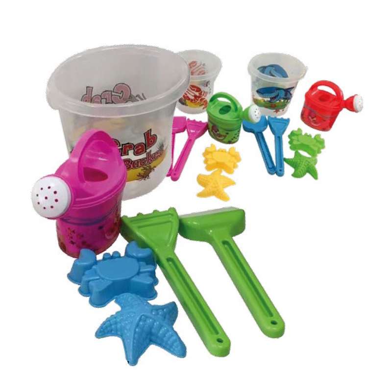 Seau garni transparent REQUIN, avec pelle, rateau, arrosoir, moules.
